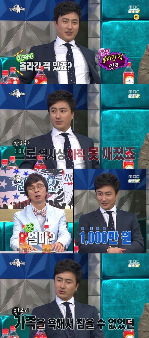 이에 안정환은 "관중석으로 올라간 적이 있다. 내가 벌금을 많이 냈다. 프로 역사상, 한국에서 아직 못 깨졌다. 천만원을 냈다"고 말했다.
