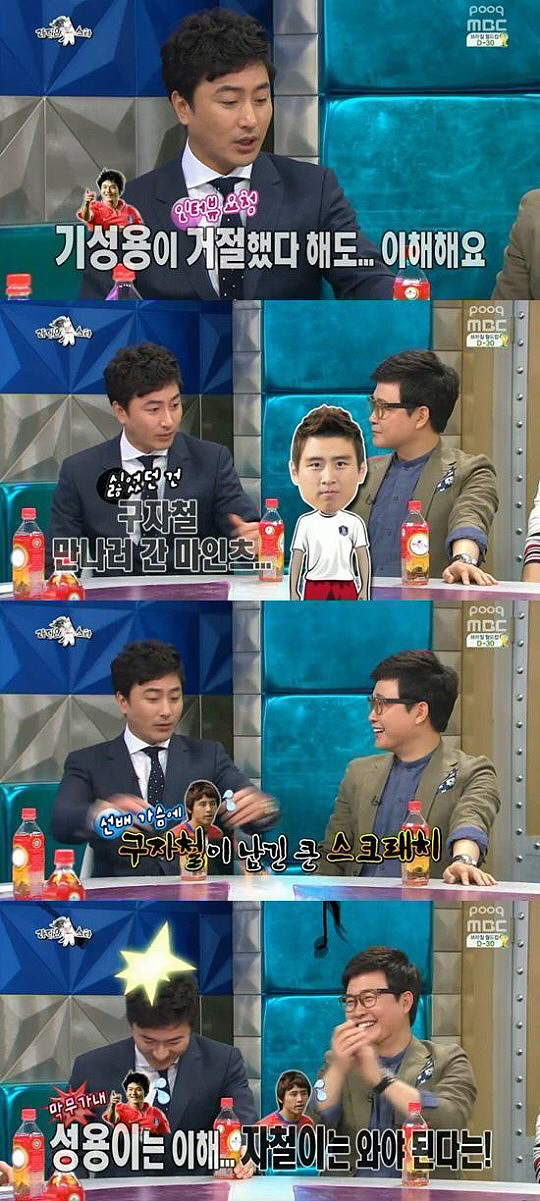 이후 안정환은 "기성용은 사정이 있으니 인터뷰를 거절했겠구나 싶지만 구자철을 만나러 마인츠까지 간 것은 싫었다"며 "본인이 오거나 중간에서 만나야 하는 거 아니냐"고 불만을 토로했다.