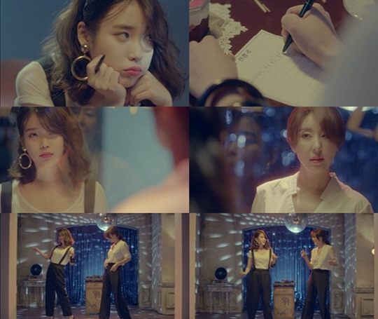 영상 속의 아이유는 90년대 분위기를 풍기며 넓은 바지와 큰 귀걸이를 착용하고 등장했다. 특히 아이유는 껌을 씹으며 '추억의 음악다방'을 찾은 손님으로 변신해 눈길을 끌었다.
