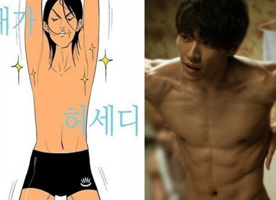배우 김영광이 영화 '목욕의 신'의 주인공 허세 역에 캐스팅된 가운데, 원작 웹툰 캐릭터와의 비교 모습이 눈길을 끌고 있다.