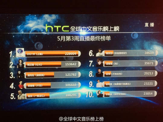 엑소-M 역시 같은 날 오후 생방송된 중국 최초의 순위제 음악 프로그램 CCTV '글로벌 중문음악 방상방'에서 출연하지 않았음에도 불구하고, 타이틀 곡 '중독(Overdose)'으로 지난 주에 이어 2주 연속 1위에 올라, 현지에서의 높은 인기를 실감케 했다.