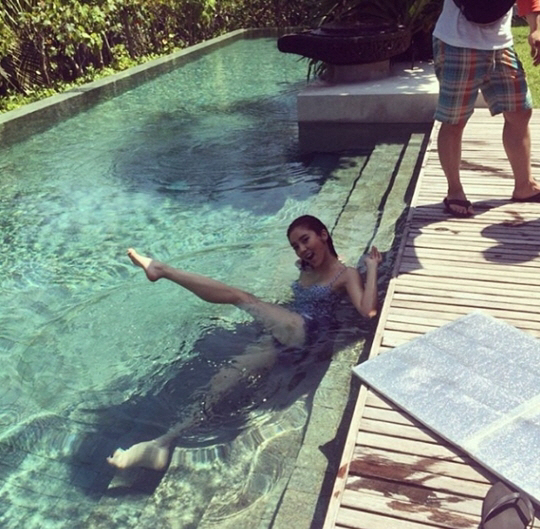공개한 사진에는 수영복을 입은 손담비가 각선미를 자랑하고 있다. 물속에 몸을 담근 그녀는 한 쪽 다리를 물 밖으로 들어 올리며 재미를 더하고 있다.