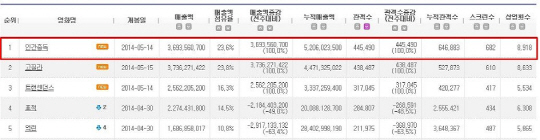 이 같은 결과는 청소년 관람불가 등급이라는 제약과 동시기 경쟁작인 '고질라' '트랜센던스' 등 할리우드 블록버스터를 뛰어넘은 것이라 더욱 의미가 깊다. 또한 '색,계'의 주말스코어(28만243명)보다 2.3배 달하는 스코어를 기록한 것으로 파격 멜로의 흥행작 탄생을 예고하고 있다.