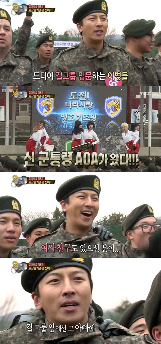 이날 '진짜 사나이' 멤버들은 맹호부대 병사들과 함께 포상휴가증을 두고 퀴즈 대결을 벌였다. 출제자는 "맹호부대에서 가장 인기 있는 걸그룹은?"이라는 퀴즈를 냈고, 그 순간 AOA가 등장했다.