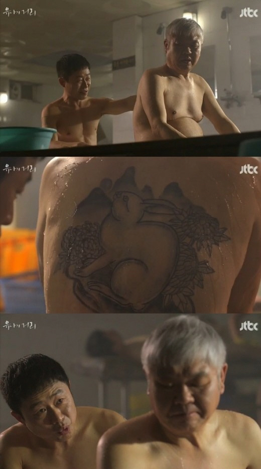 '유나의 거리'(극본 김운경, 연출 임태우) 1회에서는 일명 도끼라 불린 건달 출신 장노인(정종준)과 전직 조폭 두목 한만복(이문식)이 서로의 문신에 대해 이야기를 나눴다.