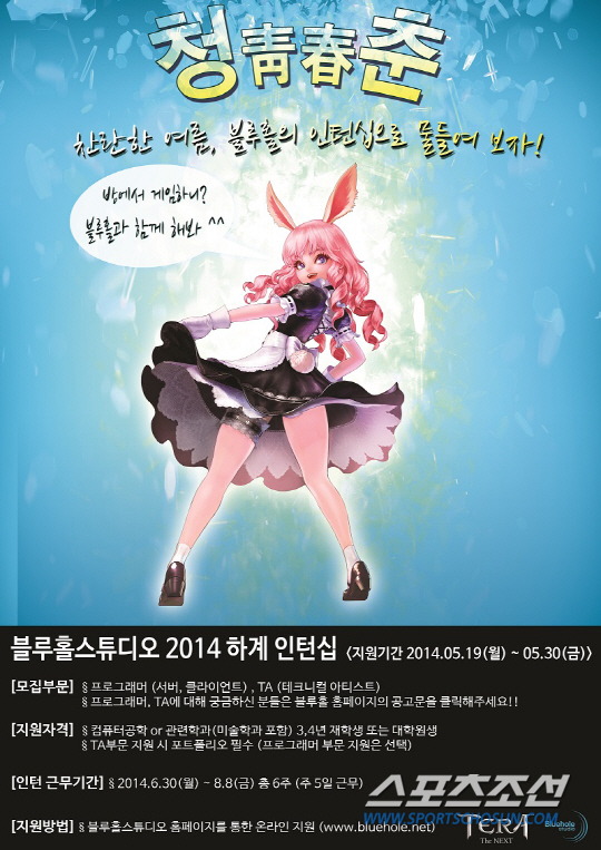 MMORPG '테라'를 개발한 온라인게임 전문 개발사 블루홀스튜디오는 2014년 하계 인턴사원을 모집한다고 19일 밝혔다.