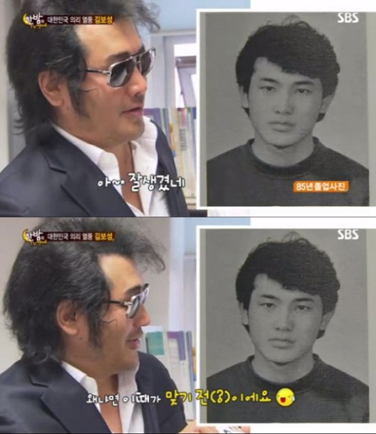 후배들과 즐거운 시간을 보낸 김보성은 교무실로 향했다. 1985년 당시 생활기록부 속 고등학교 졸업사진이 공개을 본 김보성은 "잘 생겼다. 이때가 맞기 전이다"라고 너스레를 떨었다.