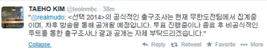 22일 MBC '무한도전' 측은 공식 트위터를 통해 "'선택2014' 공식적인 출구조사 결과는 현재 '무한도전' 팀에서 집계 중이며, 차후 방송을 통해 공개될 예정입니다"라고 밝혔다.