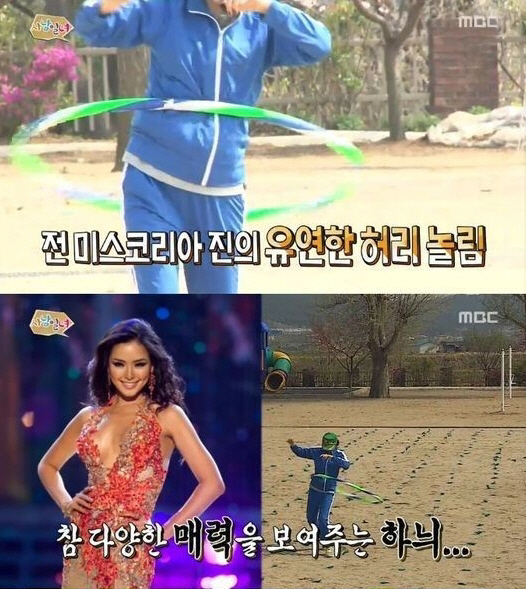 이날 '장구리 대표 선수 선발전'을 뽑는 장구리 체육대회에서 어르신들을 위해 이하늬는 훌라후프 시범을 보였다.