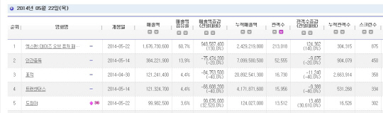 '엑스맨: 데이즈 오브 퓨처 패스트'는 개봉 첫날인 22일, 전국 21만3018명의 관객을 동원하며 누적관객수 30만4315명을 기록, 박스오피스 1위를 차지했다.