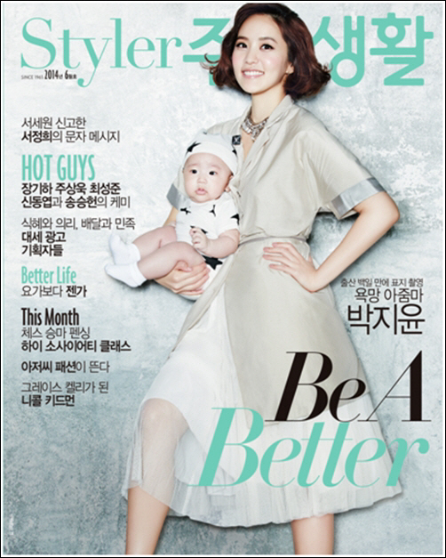 사진 속 박지윤은 위풍당당한 자세로 카메라를 바라보고 있으며, 한 팔로 이완 군을 안고 있다.