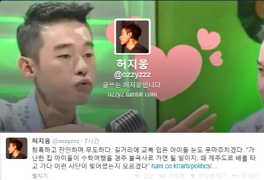 허지웅은 23일 자신의 트위터에 "참혹하고 잔인하며 무도하다. 길거리에 교복 입은 아이들 눈도 못 마주치겠다"는 글과 함께 조광작 목사의 기사를 링크했다.