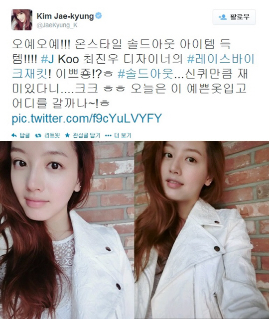 레인보우 재경이 지난 '솔드아웃' 2회 미션에서 준우승을 차지한 최진우 디자이너의 레이스 바이커 재킷을 입은 모습을 자신의 트위터(https://twitter.com/JaeKyung_K)에 올려 눈길을 끌고 있다.