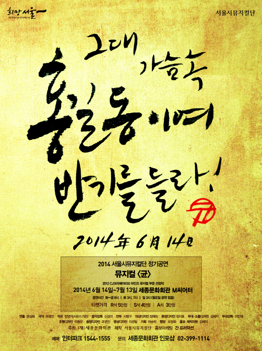 '홍길동전'의 저자인 허균(1569~1618)의 삶을 모티브로 한 창작 뮤지컬이 공연된다. 서울시뮤지컬단이 오는 6월 14일부터 7월 13일까지 세종 M씨어터에 올리는 뮤지컬 '균'(작곡 장영지, 극작 하경진, 연출 문삼화). 지난해 CJ문화재단의 크리에이티브 마인즈 뮤지컬 부문 선정작으로 눈길을 끌었던 작품이다. 가능성있는 콘텐츠를 전통의 뮤지컬단이 정식 공연으로 올려 화제를 모은다.