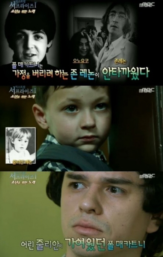 25일 방송된 MBC '신비한TV 서프라이즈'에서는 '소년을 위한 노래' 편으로 비틀즈 멤버였던 폴 매카트니와 존 레논, 그리고 존 레논 아들 줄리안 레논에 관한 내용을 다뤘다.