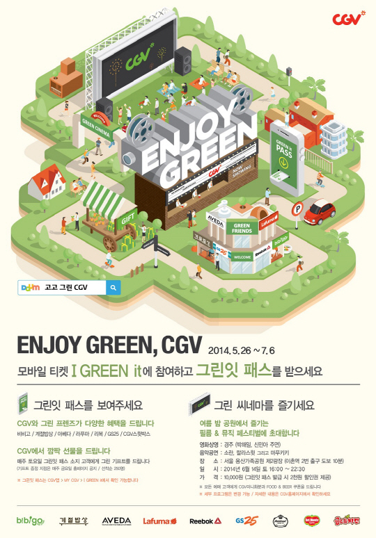 모바일 티켓 '아이 그린 잇(I GREEN IT)'에 참여해 CGV 영화 예매 후 종이 영화 티켓을 출력하지 않는 관람객들에게 '그린잇 패스'가 발급된다. 이 패스를 보유한 고객은 전국 CGV를 비롯해 비비고, 계절밥상, 아베다, 리복, 라푸마, GS25 등 지정된 그린 프렌즈 매장에서 다양한 가격 할인 혜택을 누릴 수 있다. 또 캠페인 기간 중 매주 토요일엔 CGV가 제공하는 깜짝 선물도 받을 수 있다.