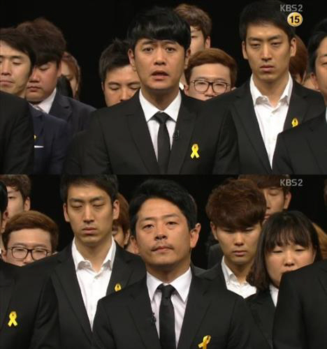 지난 25일 밤 방송된 KBS2 '개그콘서트(이하 '개콘')'는 출연 개그맨들이 모두 검은 양복에 노란 리본을 달고 등장해 세월호 참사 애도의 메시지를 전하며 시작됐다.