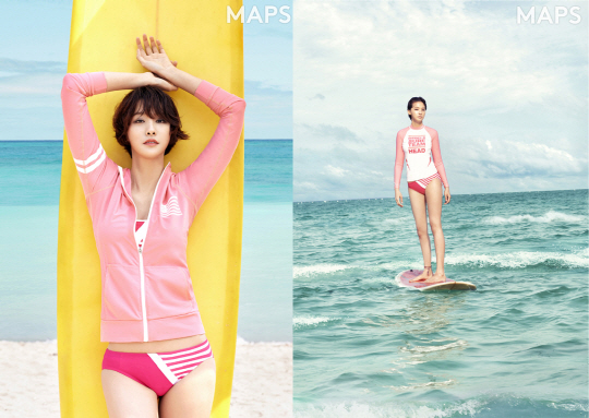 화보 속 유인영은 시원한 여름 바다를 배경으로 핑크계열의 래쉬가드와 함께 스프라이트 수영복을 매치해 늘씬한 몸매를 뽐냈다.