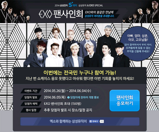 26일 삼성뮤직은 '2014 삼성전자 S데이 삼성뮤직 & EXO SPECIAL'이라는 타이틀로 엑소 팬사인회를 개최한다고 밝혔다.