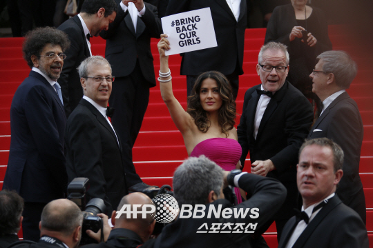 Mexican-US actress and producer Salma Hayek-Pinault (C) holds a cardboard reading "# Bring back our girls", as a sign of support for the kidnapped Nigerian schoolgirls as she arrives with French directors Paul Brizzi (2ndL) and Gaetan Brizzi (R) for the screening of the film "Saint-Laurent" at the 67th edition of the Cannes Film Festival in Cannes, southern France, on May 17, 2014. AFP PHOTO / VALERY HACHE