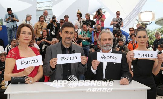 (From L) Turkish actress Demet Akbag, director Nuri Bilge Ceylan, actor Haluk Bilginer and actress Melisa Sozen hold signs reading "Soma" to pay their respect to the 284 Turkish miners who died following an explosion, during a photocall for their film "Winter Sleep" at the 67th edition of the Cannes Film Festival in Cannes, southern France, on May 16, 2014. AFP PHOTO / LOIC VENANCE
