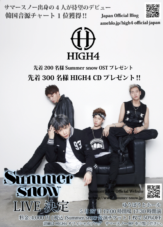 지난 4월 8일, 데뷔 싱글이자 아이유와의 듀엣곡 '봄 사랑 벚꽃 말고'로 국내 음원차트를 올킬하며 가요계에 화려하게 등장한 남성 4인조 신인 그룹 하이포가 27일, 오후 6시 일본 도쿄에 위치한 고탄다에서 첫 단독 콘서트 '하이포 썸머 스노우 라이브 (HIGH4 Summer Snow LIVE)'를 개최한다.