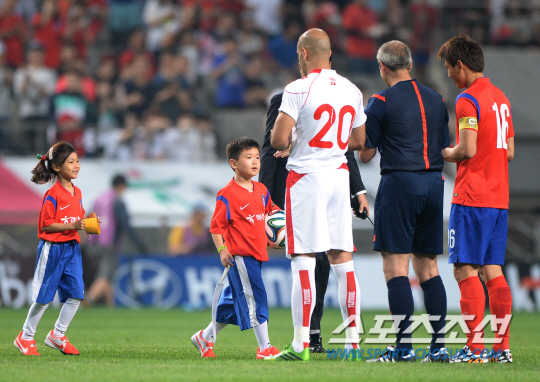 28일 오후 8시 서울월드컵경기장에서 홍명보 감독이 이끄는 축구국가대표팀이 튀니지와 평가전을 펼쳤다. 경기 전 윤후와 송지아가 매치볼을 선수들에게 건냈다.
