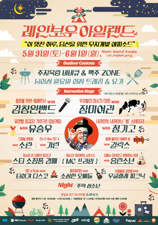 한편, '레인보우 아일랜드 2014 뮤직&캠핑'의 티켓은 예매사이트인 예스24, 인터파크, 티켓몬스터 등에서 구매할 수 있다.