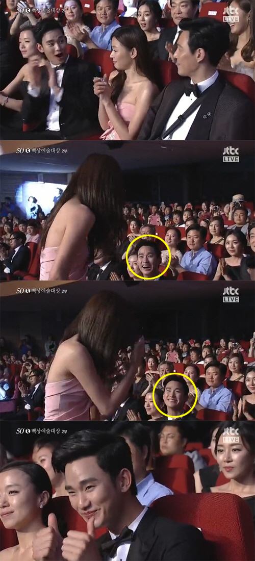 이날 전지현의 옆자리에 앉아있던 김수현은 대상 수상자로 전지현의 이름이 호명되자 입까지 크게 벌리며 당사자보다 더 놀란 모습을 보였다. 이내 김수현은 전지현을 바라보며 함박웃음을 지었고, 있는 힘껏 손뼉을 치며 대상 수상을 축하했다.