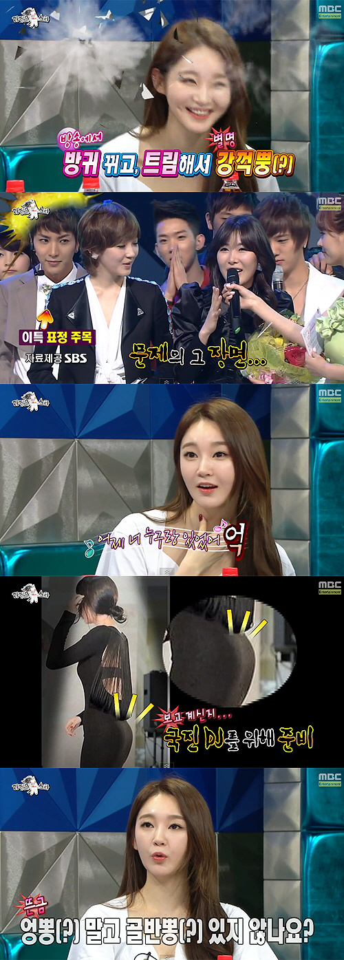 이날 MC들은 "강민경이 외모와는 다른 반전 별명이 있다. 방송에서 방귀 뀌고 트림해서 '강꺽뿡'이라고 하더라"고 운을 뗐다.