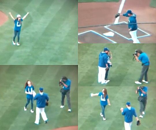 이날 수지는 하얀색 글자로 다저스라 새겨진 파란색 티셔츠에 짙은 색 청바지와 다저스 모자를 착용한 채 마운드에 올랐다.