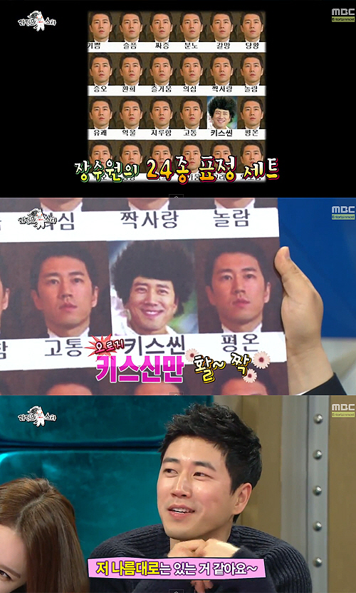 이를 들은 MC 김구라는 "장수원 표정이 한결같다고 하는데 키스신 찍을 때만 표정이 변한다더라"며 "모든 희로애락의 감정이 다 똑같은데 키스만 다르다"며 사진을 공개했다.