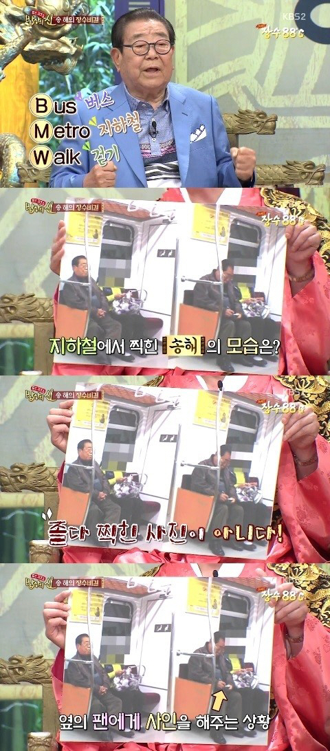 이와 함께 이날 방송에서는 네티즌 사이에서 화제가 된 송해의 지하철 이용 사진이 공개됐다.