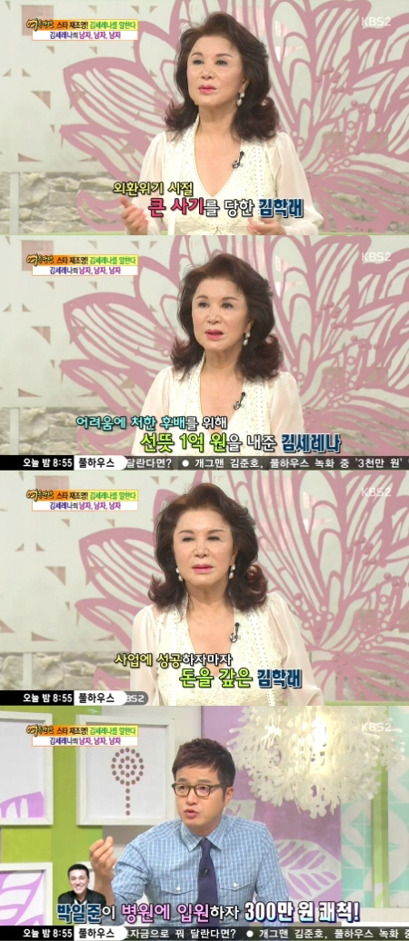 이날 김세레나는 "IMF 때 김학래가 사기를 당해 다 무너질 위기에 처했다"며 운을 뗐다. 이어 그는 "당시 얼마 있으면 되냐고 물으니까 8~9천만 원 정도가 필요하다고 하더라. 그래서 1억을 줬다"고 말해 주변을 깜짝 놀라게 했다.