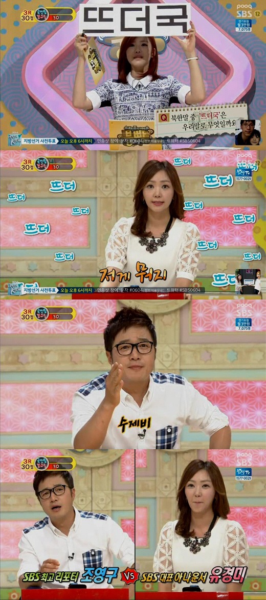 이날 아이들의 두 번 대결에 이어 각 팀의 대표로 국진팀 조영구와 경규팀 유경미 아나운서 대결에 나섰다. 두 사람에게는 북한말 퀴즈가 주어졌다.