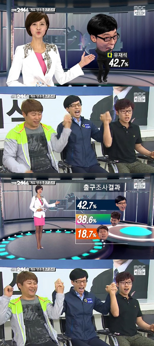 이날 투표 결과 발표에 앞서 공개된 출구조사 결과에서 기호 다 유재석이 42.7%로 1위를 차지했다. 이어 노홍철은 38.6%, 정형돈이 18.7%로 나타났다.
