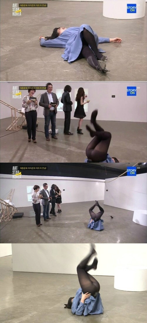 케이블채널 스토리온 '아트스타코리아'에 헐렁한 치마를 입은 여성이 갑자기 바닥에 드러누워 물구나무를 서는 이색 퍼포먼스로 주변을 충격에 빠드렸다. 더욱이 치마가 훌러덩 뒤집어진 여자는 검은 팬티스타킹을 신은 다리를 위로 치켜 올려 발바닥으로 물개 박수를 친다. 이를 지켜본 심사위원들은 경악을 금치 못했고 일부는 차마 보지 못하고 시선을 회피하다 곧이어 폭소를 터트렸다.