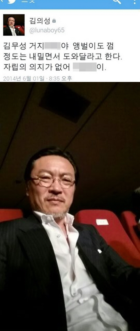김의성은 지난 1일 자신의 트위터에 "김무성 거지 ××야 앵벌이도 껌 정도는 내밀면서 도와달라고 한다. 자립의 의지가 없어 ××놈이"라며 격한 발언을 쏟아냈다.이 같은 발언은 새누리당이 6·4 지방선거 투표를 하루 앞두고 "도와주세요" 등의 문구가 적힌 팻말을 들고 '읍소 작전'을 펼치고 있는 상황에서 불거져 이목이 집중됐다.