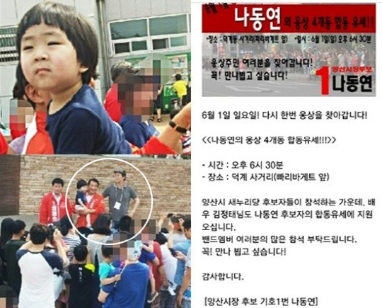 "오늘은 야꿍이와 야꿍이 아빠 김정태 배우와 함께 양산시민 여러분을 찾아 뵀습니다"라며 "너무나 귀여운 야꿍이의 인기에 나동연 후보자와 아빠 김정태는 뒷전으로 밀렸는데요. 야꿍이 덕분에 양산시민 여러분들이 함박웃음을 지었습니다"라고 글을 남겼다.