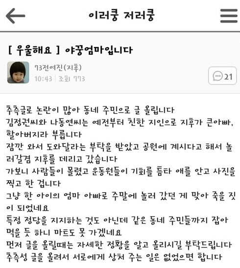 여진 씨는 최근 온라인 커뮤니티에 '야꿍엄마입니다'라는 제목의 글을 올렸다. 그는 "김정권 씨와 나동연 씨는 예전부터 친한 지인으로 지후가 큰 아빠, 할아버지라고 부른다"라고 김정권 새누리당 경남 김해시장 후보 및 나동연 새누리당 경남 양산시장 후보와의 관계를 밝혔다.