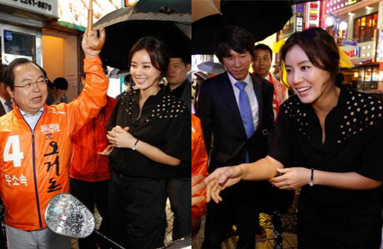 이날 김성령은 오거돈 후보와 함께 비가 오는 궂은 날씨에도 남포동 족발골목, 시장 등을 오가며 유세를 도왔다.