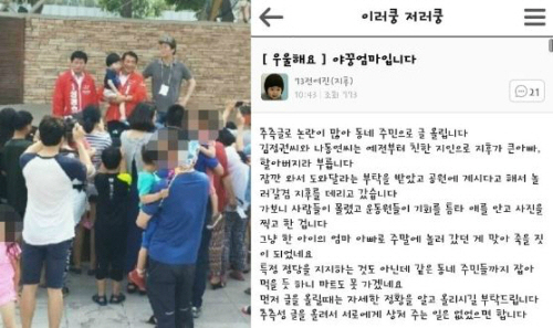 3일 전여진 씨는 한 온라인 게시판을 통해 '우울해요 야꿍 엄마 입니다'는 제목과 함께 글이 게재됐다. "김정권씨와 나동연씨는 예전부터 친한 지인으로 지후가 큰 아빠, 할아버지라고 부릅니다"라며, "잠깐 와서 도와달라는 부탁을 받았고 공원에 계시다고 해서 놀러갈 겸 지후를 데리고 갔습니다. 가보니 사람들이 몰렸고 운동원들이 기회를 틈타 애를 안고 사진을 찍고 한 것입니다"고 해명했다.