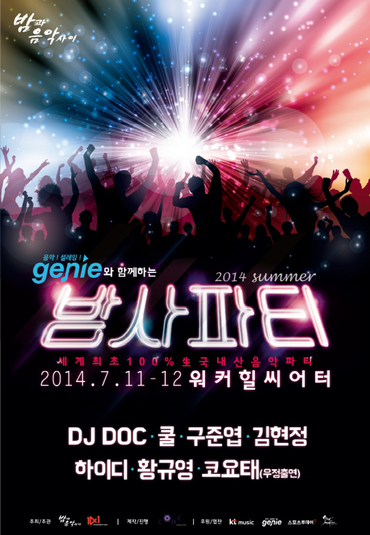 지니와 함께하는 '2014 썸머 밤사파티' 공연에 스페셜 게스트로 초청되는 가수는 DJ DOC, 쿨(이재훈,김성수), 클론(구준엽), 코요태(우정출연), 김현정, 하이디, 황규영으로 최종 확정됐다"고 밝혔다.