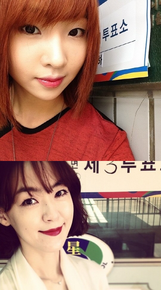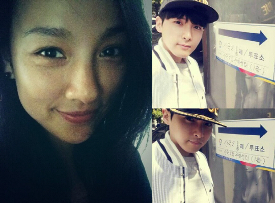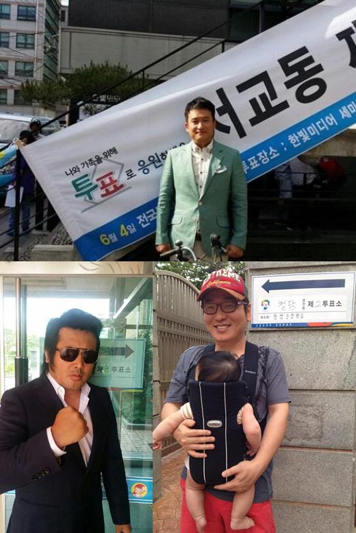 중앙선거관리위원회 공명선거홍보대사 서경석, 양복까지 갖춰 입고 '투표에 대한 의리'를 지킨 김보성, 아이를 안고 투표한 작곡가 윤일상, 가족과 함께 투표소를 찾은 주영훈-이윤미 부부와 박준형-김지혜 부부의 인증샷도 네티즌의 눈길을 끌었다. 그밖에도 샤이니 민호, 소녀시대 수영, 슈퍼주니어 김희철, 2AM 조권, 자우림 김윤아, 케이윌, 허지웅, 김지훈 등 수많은 스타들이 투표 행렬에 동참했다. 김표향 기자 suzak@sportschosun.com
