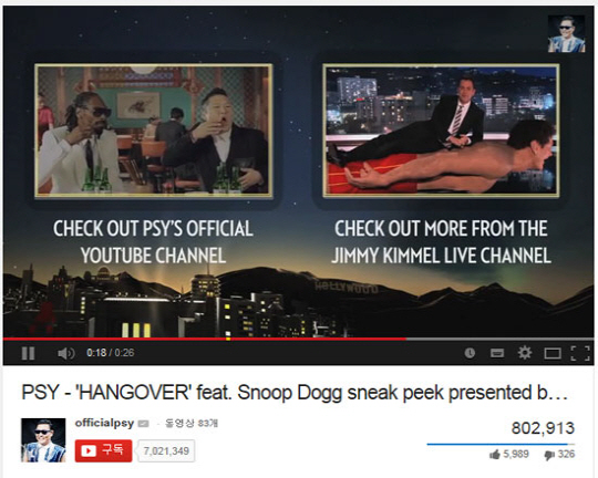 해당 영상은 키멜이 싸이와 스눕독이 출연한다는 소식을 전하며 두 사람이 함께 출연한 '행오버' 뮤직비디오 일부를 공개한 것.