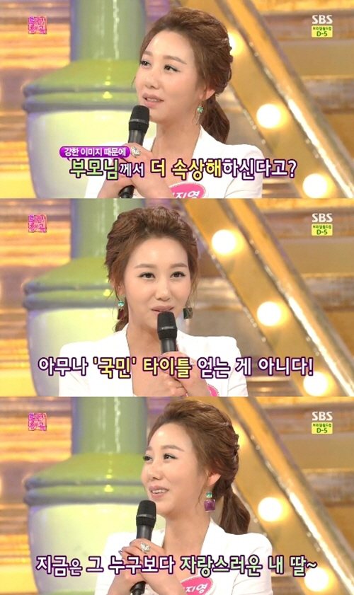 민지영은 "예전에 불륜녀 역을 할 때는 부모님이 싫어하셨다. 하지만 '국민 불륜녀'라는 타이틀이 붙자 '국민이라는 수식어 붙는 것 쉽지 않다'며 부모님도 이제 좋아하신다"고 말해 웃음을 자아냈다.