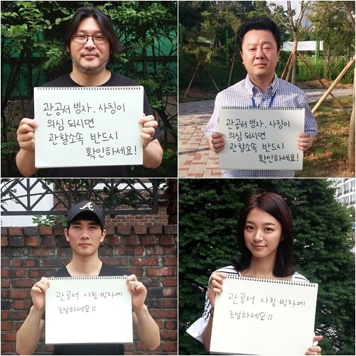 배우 최무성, 박수영, 엄태구, 송지인 등이 스케치북에 '관공서 빙자, 사칭 피해 예방'과 관련된 메시지를 담아 홍보를 하고 있는 모습의 사진을 공개했다.