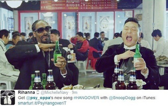 9일(한국 시간) 리한나는 자신의 트위터에 "스눕독과 함께 부른 싸이의 신곡 '행오버'를 아이튠즈에서 구입했다(Get @psy_oppa's new song #HANG OVER with @SnoopDogg on iTunes)"라는 글을 게재했다.