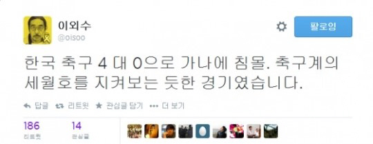 10일 이외수는 자신의 트위터에 "한국 축구 4대 0으로 가나에 침몰. 축구계의 세월호를 지켜보는 듯 한 경기였습니다"라는 글을 남겼다. 이에 이외수의 비유가 적절치 않다는 지적이 일자 "속수무책으로 침몰했다는 뜻인데 난독증 환자들 참 많군요. 게다가 반 이상이 곤계란들"이라고 반박했다.