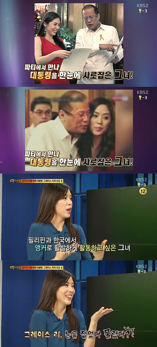 이날 필리핀 대통령 전 연인 그레이스 리는 대통령과의 열애설에 대해 "주목받는 게 좋지만은 않았다. 다른 분을 통해서 유명해진 거니까 나쁜 추측 기사들이 너무 많이 나와 가족들과 상처를 받았다"고 토로했다.